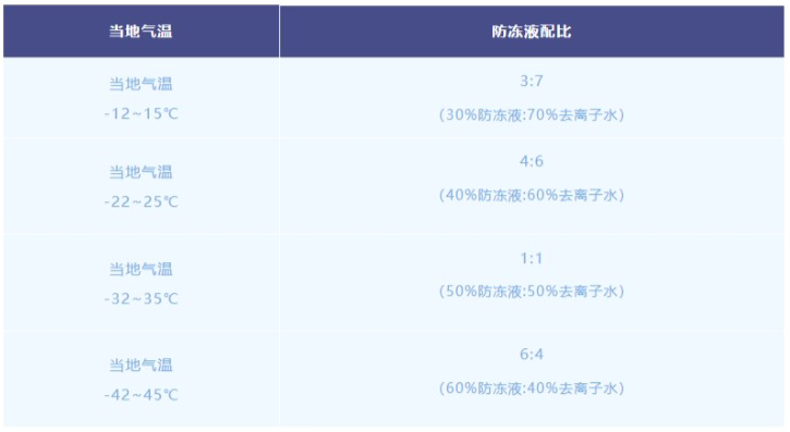 ● 使用濃度不能低于20%,不同氣溫有不同配比,請參考下表。如對配比有任何疑問,可咨詢我司售后服務熱線:400-8229-288 ;